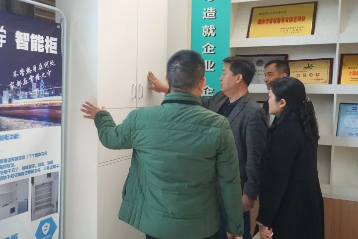 周董陪同安監局領導一行參觀并展示了智能衣柜、生態板等公司產品