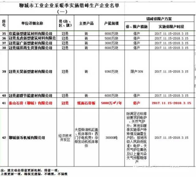 近日,聊城環保局公布的《工業企業采暖季實施錯峰生產企業名單》中顯示 泰山石膏(聊城)有限公司必須在2017年11月15日到2018年3月15日停產,泰山石膏(聊城)有限公司主要生產紙面全年產能5000萬平方米,屬于產能較大石膏板企業,現在已停止生產,根據最嚴”停工令“指示今日凌晨起全國石膏板企業必須停止生產,石膏板進入“拼庫存”,“拼調撥”時期。