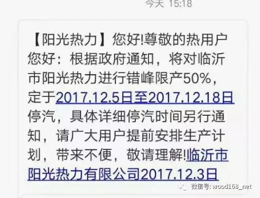 中國(guó)木業(yè)信息網(wǎng)駐臨沂記者獲悉,12月3日上午,臨沂陽(yáng)光熱力燃?xì)鈺?huì)議通報(bào):為落實(shí)臨沂市委市政府關(guān)于大氣污染物排放指標(biāo)(不是因?yàn)樘烊粴饩o缺,是因?yàn)檎h(huán)保指標(biāo)的壓力)的安排,臨沂燃?xì)鈮嚎s產(chǎn)能50%,各支線分段停氣13天,這表示使用陽(yáng)光熱力燃?xì)獾陌宀钠髽I(yè)將被分期迫停產(chǎn)13天。