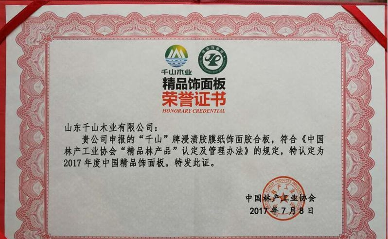 2017年7月,中國木質林產品質量提升與品牌建設高峰論壇在廣州舉行,2017 中國建博會(廣州)同期舉辦,本次論壇上,以打造高質量的產品和服務為核心的發展理念已經成為林產行業的普遍共識。中國林產工業協會按照《中國林產工業協會“精品林產品”認定及管理辦法(試行版)》組織評審后,授予千山木業等43家企業59項產品為2017年度“精品人造板(含飾面板)”、“精品裝飾紙”,以鼓勵整個行業努力進取、開拓創新,促進行業的健康有序發展。