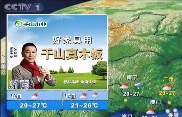 為了進一步擴大品牌知名度,提升經銷商對品牌的信心,讓更多消費者了解千山真木板產品,繼央視CCTV-1新聞聯播前千山真木板廣告正在播出之時,千山木業又出大手筆,于7月、8月在央視CCTV-1,CCTV-13兩檔天氣預報欄目,進一步宣傳“好家具,用千山真木板”的品牌理念。央視CCTV-1 和央視CCTV-13為全國電視權威頻道,19:00-20:00是收視率黃金時段,《天氣預報》在19:30分播出,位于中央電視臺黃金時段的核心位置。