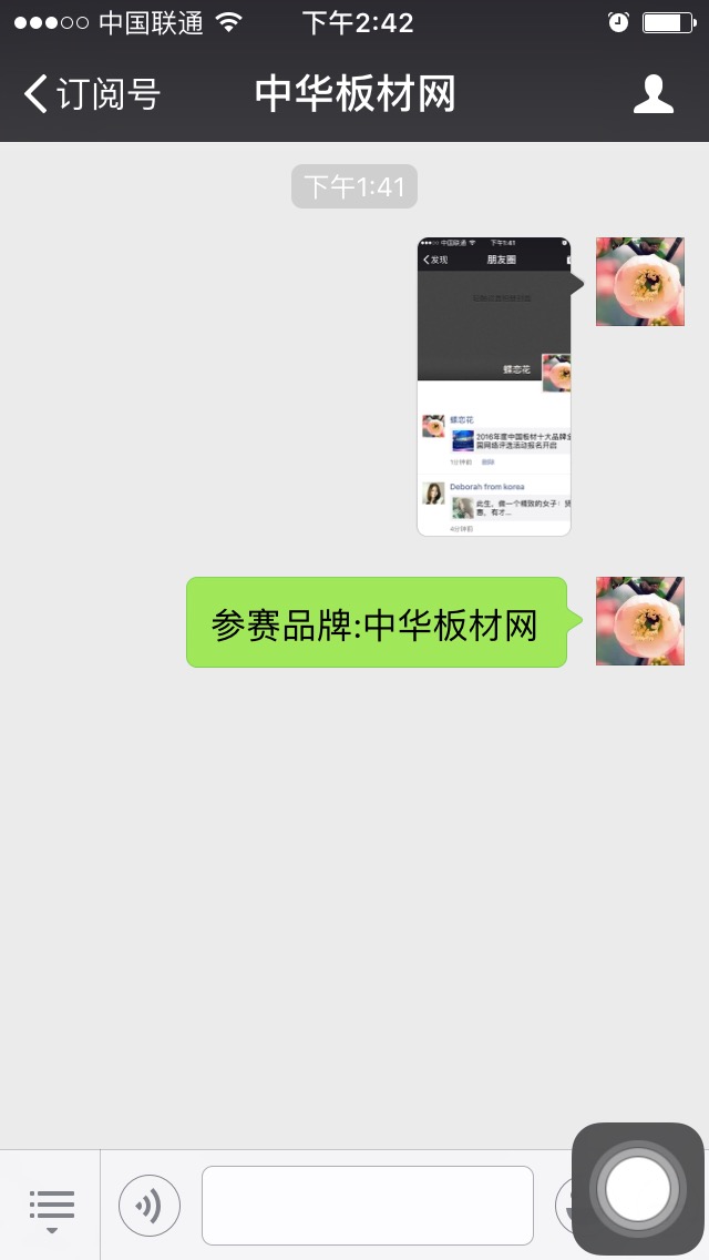 凡事參賽的品牌,在微信上分享或轉發《2016年度中國板材十大品牌全國網絡評選活動報名開啟》內容,將您轉發或分享的截圖。用留言方式發給板材網公眾號,或者QQ。如下圖所示: