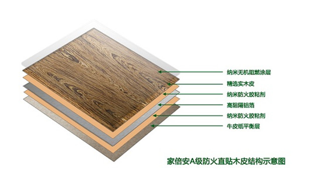 “家倍安”A級防火直貼木皮,由綠色環保納米材料涂覆的優質實木木皮和高阻隔、防火、隔音、消磁軟態鋁箔加牛皮紙平衡層通過新型防火膠粘劑高溫高壓一次物理復合而成。