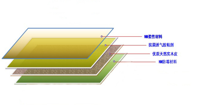 “家倍安”彈性超柔免漆木皮包含三層獨特構造:納米柔性材料——抗菌透氣膠粘劑——優質實木皮(天然木或科技木)——納米防霉材料。