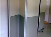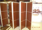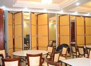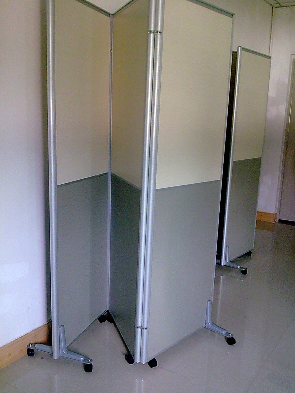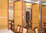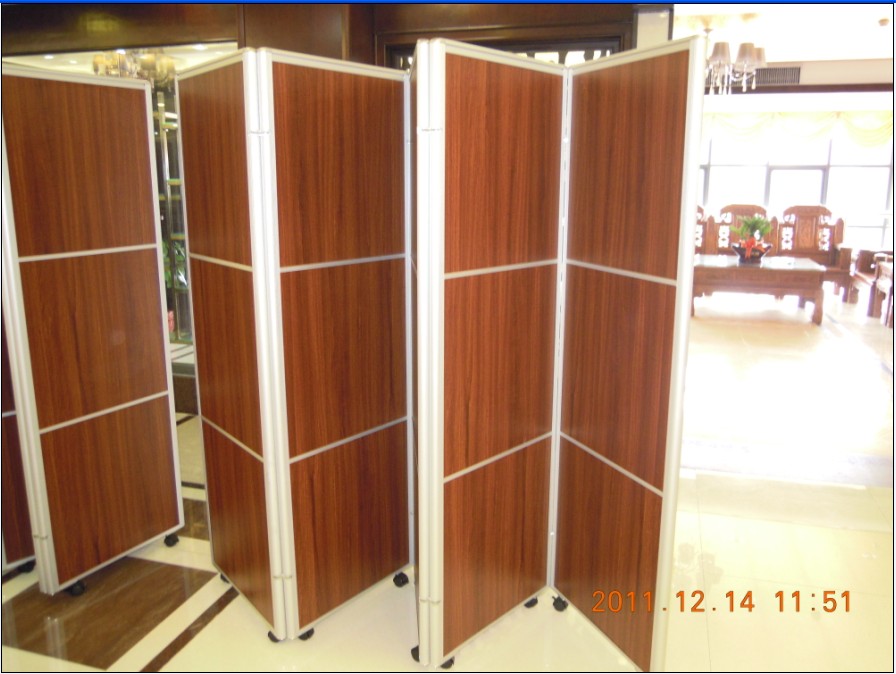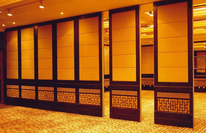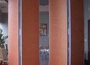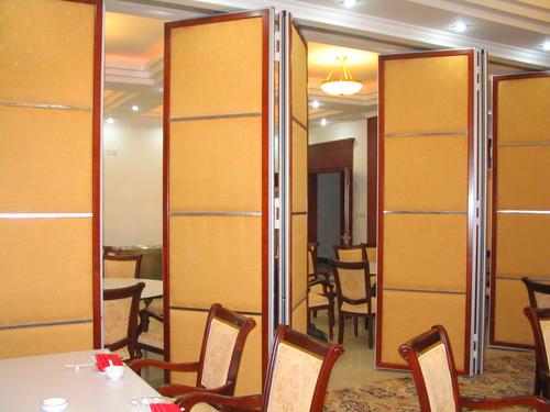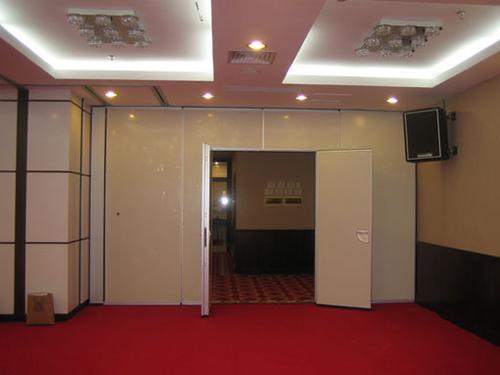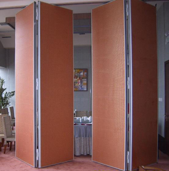 折疊門,由多片隔扇組成可以折疊的活動隔斷。有寬扇式和窄扇式兩種。寬扇式所采用的隔扇和推移式活動隔斷所采用的相同,每片隔扇的上部采用一組可轉變方向的滑輪安裝在導軌上,用鉸鏈把隔扇連接起來,不用時可折疊起來推入貯藏室。這種隔斷受牽制的因素較多,處理不當可能不易推動,因此有采用兩片隔扇一連的雙扇折疊式。窄扇折疊式活動隔斷的隔扇寬度常為10~30厘米,有軟質雙折式和硬質單折式(圖2)。硬質單折式的,多采用纖維板、塑料板或薄鋼板作隔扇,用塑料或金屬作鉸鏈。每片隔扇用一組可轉變方向的滑輪安裝在導軌上,成為一樘可折疊的滑動隔斷。雙折軟質的,多用薄鋼片制成可伸縮的套接鉸鏈式骨架,上面有滑輪,裝入導軌。鉸鏈式骨架的兩面都裝上軟質人造革或塑料布,可以象手風琴一樣合攏拉開。這種隔斷重量輕、美觀、容易安裝,并可圍成曲線形,使用靈活。還可在夾層中襯墊薄鋼板和吸聲材料,提高隔聲能力。