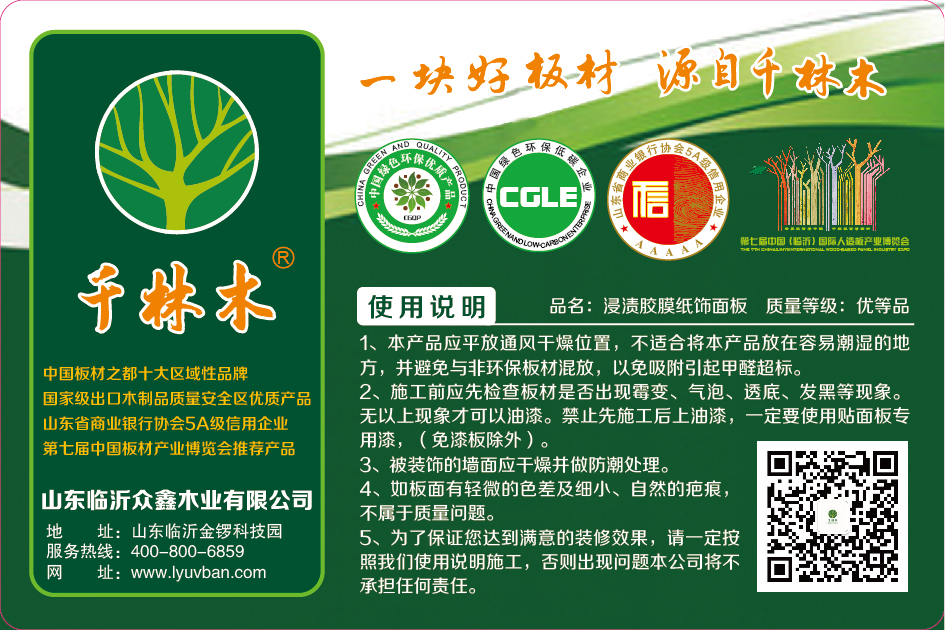 臨沂眾鑫木業有限公司坐落于美麗的中國板材之都、中國商貿名城、中國物流之都的核心區——臨沂金鑼科技園區。該公司以科技創新為本,是集科研、開發、生產、銷售、服務為一體的綜合型木業企業,現擁有木業產業高端科研人員10名,并柔性引進院士1名。公司開發研制了“千林木”系列裝飾貼面生態板、“歐萊”系列uv板,技術設備領先、生產工藝精湛、產品質量一流,一直以來熱銷市場,受到國內外廣大消費者的高度好評。本公司專業生產加工馬六甲板、密度板、桐木貼紙、uv板等新型綠色環保系列產品,具有“做工精美、色澤鮮活、質量高端、經久耐用、生態環保”的特點,在同類產品中品質領先、名列前茅、受到熱捧。
