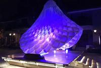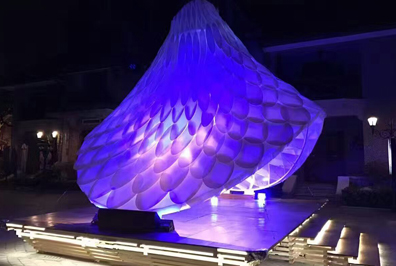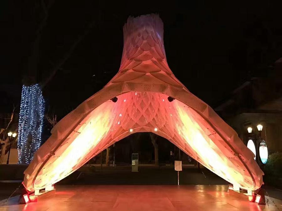 為了找到表現外部羽毛的材料,更是反復實驗。材料既要輕盈易于造型,又要堅固安全,既要透明簡潔,又要富裕變化。在經過一系列的國內外材料實驗對比之后,才選定優威斯特樹脂板材夾心彩幻膜,里面采用半透明聚丙烯材料(polypropylene)。最終的效果是驚艷。如夢似幻。