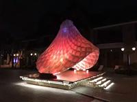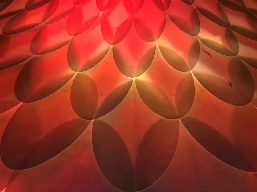 為了找到表現(xiàn)外部羽毛的材料,更是反復(fù)實(shí)驗(yàn)。材料既要輕盈易于造型,又要堅(jiān)固安全,既要透明簡(jiǎn)潔,又要富裕變化。在經(jīng)過(guò)一系列的國(guó)內(nèi)外材料實(shí)驗(yàn)對(duì)比之后,才選定優(yōu)威斯特樹(shù)脂板材夾心彩幻膜,里面采用半透明聚丙烯材料(polypropylene)。最終的效果是驚艷。如夢(mèng)似幻。