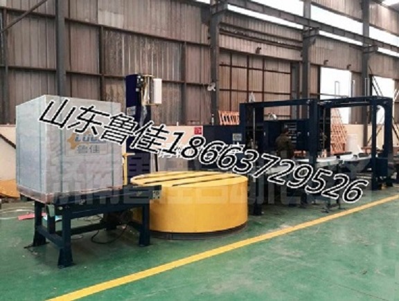 4次打包完畢后旋轉平臺下降,,包裝物繼續(xù)輸送。