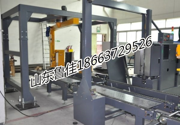 第一步,垛體輸送到位,旋轉平臺升起,打包機穿劍槽經(jīng)動力電機傳動,前移到對接位置,當碰觸到開關后,停止前移。